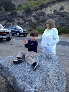 There were some rocks by the side of the road that the boys climbed on.